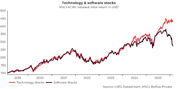Sinds 2019 evolueren beide lijnen bijna synchroon. Logisch ook, de softwaresector is een subsector van de technologiesector, en was jarenlang de motor achter het succes van de technologiesector. Sinds de tweede helft van 2025 ontkoppelen de lijnen. Hoewel de technologiesector in zijn geheel stabiel blijft, dalen software-aandelen plots. Twee factoren bepalen deze forse daling.